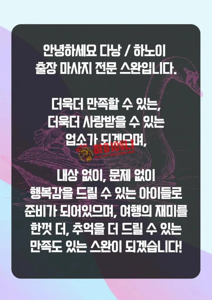 - 내상없이, 문제없이 행복감을 드릴 수 있는 아이들로 준비가 되어 있으며, 여행의 재미를 한껏 더, 추억을 더 드릴 수 있는 스완이 되겠습니다.