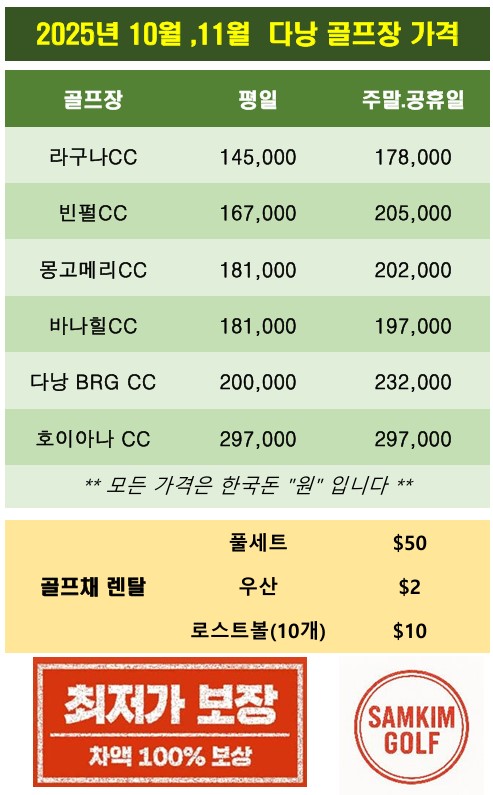 다낭 레전드, 몽고메리, 바나힐, 라구나 랑코, 호이아나 등 수준별 티타임 확보 지원.